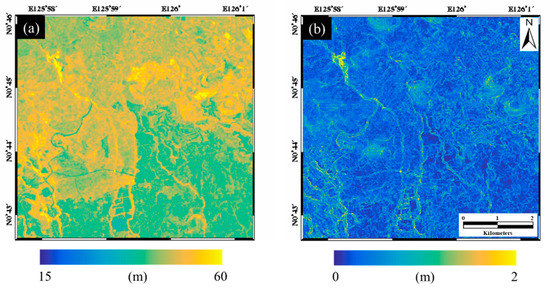 Two input neurons of MLP-ANN were created from existing DTM and DSM. The DSM and DTM were resampled into 2.8 m GSD, and then used to generate a canopy height map from the difference between DTM and DSM. In this study, the average canopy height (hereafter ‘avgCH’) and standard deviation canopy height (hereafter ‘stdCH’) maps were, respectively, generated by using a moving window of 11 × 11 to estimate the average and standard deviation of the height of the tree communities. A size of the moving window was empirically determined based on the spatial resolution of DTM, DSM data and size of the tree communities. Figure 8 shows the avgCH and stdCH maps. The avgCH map estimated from the InSAR-derived DSM can be reduced in proportion to the real canopy height. For the most part, the avgCH values ranged from 10 to 20 m. In some areas, the avgCH values were up to 30 m. The stdCH map can be used to recognize the variation of the height of adjacent trees (Figure 8b). That is, the stdCH values were allowed for the visual identification of the difference in the forest vertical structure. These values were not higher when the avgCH values had a higher value, as seen in Figure 8b. The stdCH map had a smaller value in the regions where the forest canopy height was almost constant, while it had a higher value in the regions where the canopy height variation was severe. This is because the higher the stdCH values, the greater the difference in the height of adjacent trees in the community. In addition, higher stdCH values indicate a higher forest vertical structure [38].