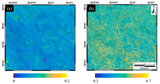 Coherence maps calculated from the (a) non-filtered and (b) filtered differential interferograms.