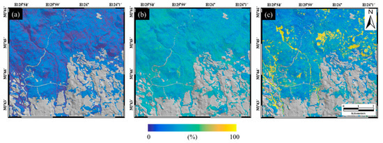 The forest vertical structure was classified into three layer-structures. The layer structure included all the canopy layers, the understory layer, and the shrub layer was defined by the triple-layer structure. The forest vertical structure, including two among the canopy, understory and shrub layers was defined as the double-layer structure, and the structure including only one among the layers was defined as the single-layer structure. Figure 11 shows the probability maps using the MLP-ANN approach from the training/validation data of single-layer, double-layer and triple-layer structures shown in Figure 10. Figure 11a shows the probability map of the single-layer structure, Figure 11b presents the probability map of double-layer structure, and Figure 11c shows the triple-layer structure. From the probability maps, we can recognize that (i) most pixels in the single-layer probability map have relatively low values of less than 30%, (ii) most pixels in the double-layer probability map have values between 40% and 60%, and (iii) some pixels in the triple-layer probability map have probability values higher than 80%, while some pixels have probability values lower than 20%. The low values in the single-layer probability maps illustrated that the single-layer forest almost did not exist in the study area. In the triple-layer probability map, the probability values greater than 80% indicate that the triple-layer forest is likely to be in the higher value area, while the probability values higher than 20% mean that there is almost no probability that the triple-layer forest is likely to be in the lower value area. This may mean that the possibility of triple-layer forest identification could be clearly distinguished. The probability of the double-layer forest ranged between 40% and 60%. The probability density function (pdf) of the double-layer forest was closer to the Gaussian distribution than the single and triple-layer forests. This may show that the double-layer forest can be dominant in the study area. Additionally, this may also indicate that the double-layer forest is difficult to distinguish clearly from the single and triple-layer forests.