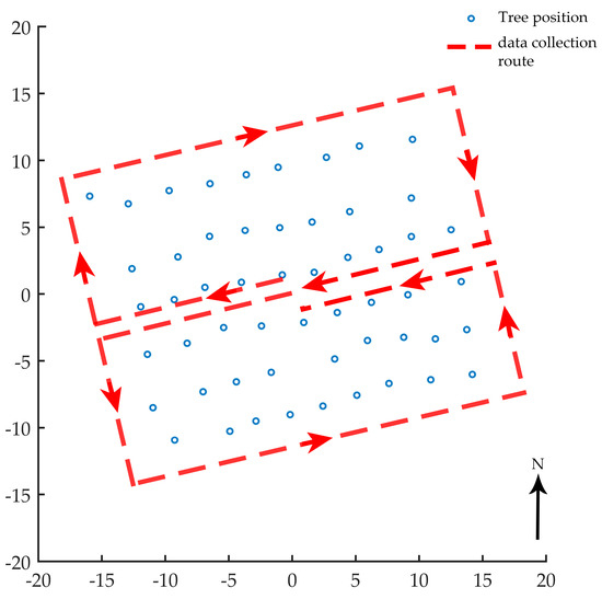 For point cloud data acquisition of each plot, the PLS operator walked in an approximate figure-eight shape, which is often used in outdoor point-cloud-based modeling. As shown in Figure 2, the operator began and ended at the center to make a closed route. The practical walking path should be fixed by the operator on the spot with all the stems covered inside the route. After confirmation, the point cloud data was exported and clipped by the operator. While collecting data, rough co-registration was generated in real-time. When the scanning was finished, a more precise co-registration was implemented, which took a few minutes for each plot. The average point density of each plot was 21,028 points/m2.