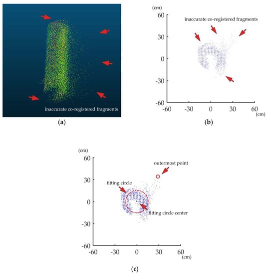 Figure 5a,b shows a PLS-based horizontal projected stem point cloud with inaccurately co-registered fragments. In the point cloud with incorrect co-registration, some fragments bulge out of the surface. The projected point cloud looks like a ring with some crescent fragments inserted on it. The point cloud fragments with inaccurate and good co-registration are overlapping. There is no exact boundary between them. Thus, it is difficult to filter out the overlapping inaccurate co-registered fragments. In those inaccurately co-registered fragments, some points are far from the real stem surface, which usually leads to significant DBH overestimation for algorithms based on circle fitting. The developed ANDPA method identified the bulgy points as outliers before removing them for a better DBH estimation. These outliers usually distribute far from the fitting circle center. If there are any outliers outside the fitting circle, they are most probably the farthest from it. To describe such points, the concept of the outermost point is involved. Here, we defined the outermost point of the projected point cloud as the point farthest from the fitting circle center. Figure 5c shows an example of the identification of the outermost point.