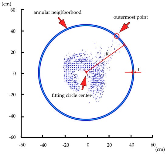 To determine when the iterative point removal process should end, the annular neighborhood of the outermost point was also involved in this study. We defined the distance between the outermost point and the fitting circle center as R. The distance between the inner and outer circle was described as pre-determined thickness value t. The annular neighborhood of the outermost point was an annular area with the center located on the fitting circle center. The outer radius was R, and the inner radius was max((R − t), 0). Figure 6 shows an example of the annular neighborhood of the outermost point.