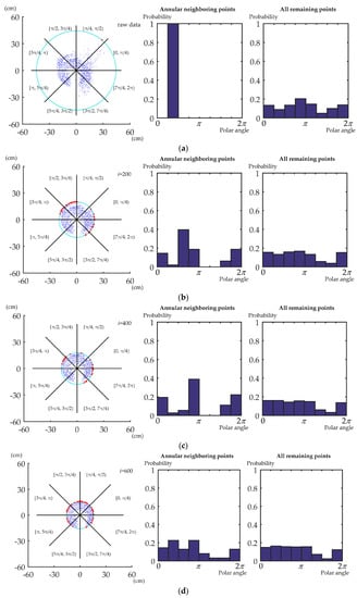 Figure 7 shows an example of the polar angle distribution of the points within the annular neighborhood and all the remaining points while iteratively removing the outermost points. All points are divided into groups with equal polar angle range. The probability distribution of the polar angle is used to describe the polar angle distribution. In Figure 7a–c, the outermost point is an outlier. The polar angle distribution of the points within the annular neighborhood tends to be centralized around a certain angle. The distribution is very different from that of the remaining points. In Figure 7d, the outermost point tends to have good co-registration. All the points located farther from the center than this well co-registered point have already been removed. It means most of the outliers have been filtered out. The polar angle distribution of the points within the annular neighborhood is thus relatively uniform and similar to that of all remaining points. The degree of similarity is quite close for all the outermost points with good co-registration compared with the outliers. This becomes a distinguishing criterion that is adopted by the algorithm.