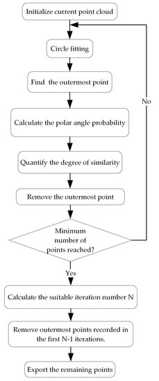 As illustrated in Figure 8, the imported projected point cloud was first set as the current point cloud. The algorithm iteratively analyzed and removed points. In each iteration, circle fitting was implemented first. The center of the fitting circle was called point O. The outermost point of the point cloud was identified and called point M. The polar angle probability distributions for points in the current point cloud and in the annular neighborhood of M were calculated. For both point clouds, O was set as the origin. The polar angle of each point was made with the positive direction of the x-axis. The degree of similarity between the two distributions was quantified as value S based on relative entropy. The index of the outermost point, the index of the current iteration, and value S were recorded for future analysis. At the end of each iteration, the outermost point M was removed, and the current point cloud was updated. After the iterative analysis, the suitable iteration number N for point removal was calculated based on the recorded similarity value S. From the initially projected point cloud, all outermost points recorded in the first N iterations were removed. The remaining points were exported as the output point cloud.