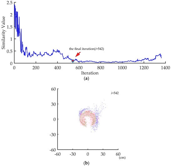 The aim of iterative distribution analysis is to show the variability of similarity value and find the critical point when the outliers are properly removed. Considering ANPDA’s outlier identification strategy, more iterations theoretically provide more data to describe when the similarity value becomes relatively stable after the outliers have been properly removed. Under ideal conditions, the iteration should continue until there are so few points remaining that the polar angle distribution would be easily influenced by random error. However, there is still a type of error that requires practical attention. A projected point cloud is usually in the shape of a ring. Although the outliers outside the outer circle of the ring cause the main error, there are still many points with big error inside the inner circle. During the analysis, the outermost points are iteratively removed. After removing most points with good co-registration, the proportion of the inside error points can be quite high. When the current point cloud consists of insufficient remaining points, it is also not well co-registered. These point clouds are not suitable for describing the characteristics of a good co-registered point cloud and should be excluded from the iterative distribution analysis. Considering the above, the termination criterion of iterative distribution analysis is determined. In this study, a minimum remaining points number of 500 was used to reduce the influence of the inner error points.