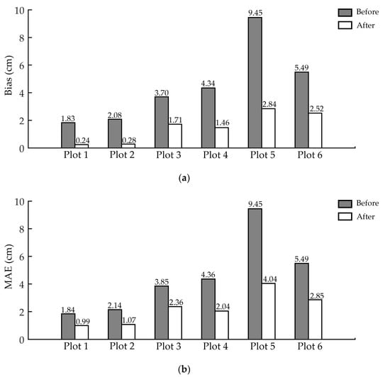 Table 4 shows the improvement of DBH estimation accuracy in all six test sites. The bias of the estimation was from 0.24–2.84 cm. The reduction rate of the bias was 53.80–87.13% after applying ANPDA, which showed high reliability at the plot level. The reduction rates of MAE and RMSE were 38.82–57.30% and 27.17–56.02%, respectively. It meant that the variation of the DBH estimation around the reference data had decreased. The estimation became more reliable after applying ANPDA. It could be seen from Figure 10 and Table 4 that after applying ANPDA, the bias, MAE, and RMSE of the DBH estimation results decreased in all six test plots. These results showed good adaptability of ANPDA for different working conditions.