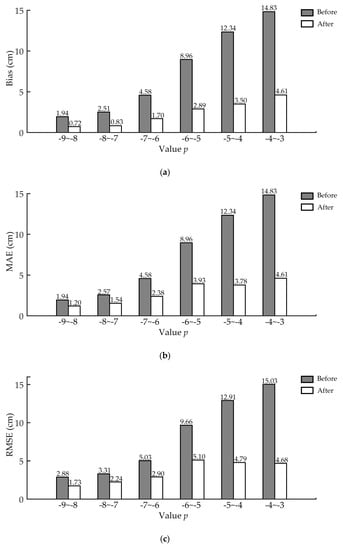 After classifying the qualified horizontal point clouds with value p, the performance of ANPDA for point cloud slices of different quality was analyzed. Figure 11 shows that without applying ANPDA, the data of lower quality led to higher DBH estimation error. After applying ANPDA, the difference in the error for all six classes became smaller. There was a decline in all three accuracy indicators for the DBH estimation error after applying ANPDA.