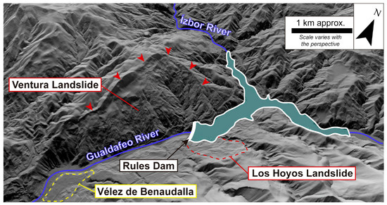 From a geomorphological point of view, the Rules Reservoir is situated at 279 m above sea level in a sediment-filled V-shapped valley excavated by the Gualdalfeo River, mainly in the Alpujárride Complex phyllites. The Sierra de los Guájares and Sierra de Lújar, reaching 1200 and 1800 m, respectively, in elevation, constitute the eastern and western limits of the reservoir (Figure 1). Sierra Nevada corresponds to the reservoir northern divide, reaching up to 3400 m (Figure 1). The elevation of these ranges generates high topographic gradients, as the local relief is 3000 m maximum at just 35 kilometres from Sierra Nevada to the coastline. Such gradients have led to a deep fluvial incision that triggers abundant slope instability processes in this area [43]. Consequently, several landslide inventories have been produced along the Ízbor and Gualdalfeo River basins [43,44]. Moreover, Irigaray et al. 2000 [45] carried out a landslide susceptibility analysis of the area, associating the highest susceptibility areas to the Alpujárride phyllites.