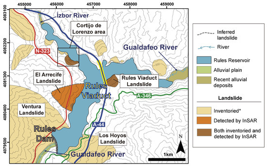 From our InSAR data, we also found out that the Rules Dam and the slopes on which the structure rests show no displacement (Figure 3). Within both slopes, Fernández et al. 1997 [43] firstly mapped two large landslides that we named as ‘Ventura Landslide’, a Deep-Seated Gravitational Slope Deformation (DSGSD), and ‘Los Hoyos Landslide’, a rock slope failure (RSF) of the lateral spread type (Figure 4). Moreover, other critical structure in the study area seems to be affected by a slight deformation also detected through our DInSAR analysis. Along the southern edge of the Rules Viaduct, we obtained a set of points showing positive values of displacement rates between 7 and 10 mm/year (Figure 3B), which indicates a slight displacement of this viaduct segment.