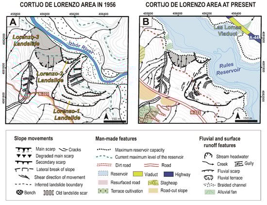 Geomorphological maps of the Cortijo de Lorenzo area in 1956–1957 (A) and at present (B).