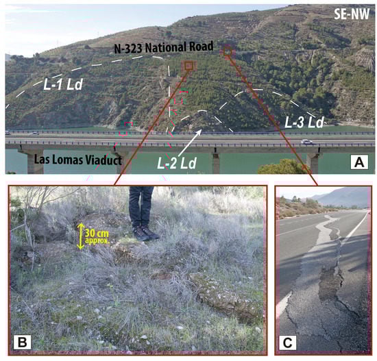 (A) Photograph of the Cortijo de Lorenzo area. The Lorenzo-1 Landslide, Lorenzo-2 Landslide and Lorenzo-3 Landslide are abbreviated as L-1 Ld, L-2 Ld and L-3 Ld, respectively. (B) Opened cracks next to the head scarp of the Lorenzo-1 Landslide. Notice the vertical slip of 30 cm, as maximum. (C) Bump across the N-323 National Road.