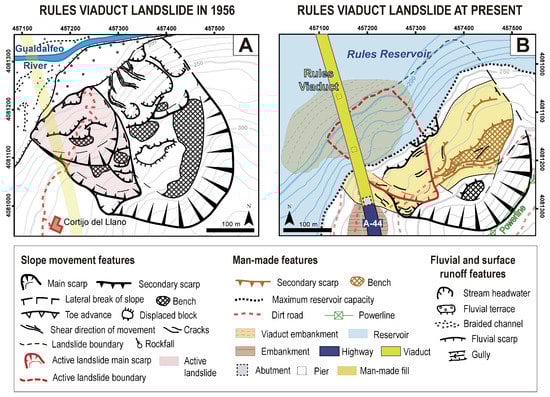 Geomorphological maps of the Rules Viaduct Landslide in 1956–1957 (A) and at present (B).