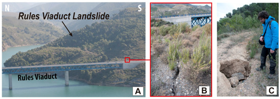 (A) Photograph of the Rules Viaduct Landslide. (B) Opened cracks near the southern abutment of the Rules Viaduct. (C) Sinkhole within the anthropic filling.