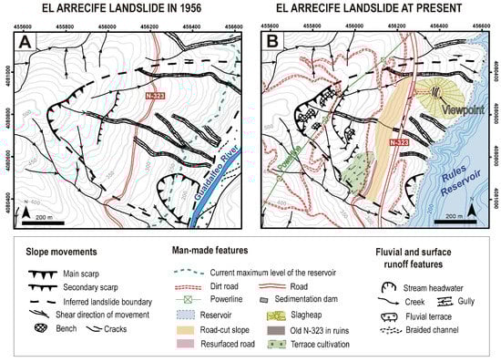 Geomorphological maps of the El Arrecife Landslide area in 1956–1957 (A) and at present time (B).