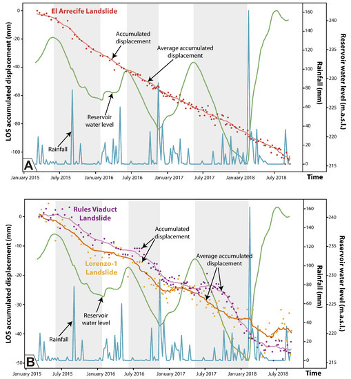 The most remarkable fact that we observed was the correlation between the Rules Viaduct and the Lorenzo-1 landslides’ TS, with variations in the water level of the reservoir. We identified three considerable drops of the water level that coincide with three periods of acceleration of the movement, that are evidenced by a change in the slope of the average accumulated displacement rate (Figure 12B). The first and the second periods of acceleration corresponds to autumn 2015 and summer–autumn 2016, respectively, while the third and the longest period of acceleration occurs from summer 2017 to winter 2018 (Figure 12B). On the contrary, displacement is not accelerated when water level increases, which depends directly on the amount of rainfall. The El Arrecife Landslide TS shows a slight acceleration period during autumn 2015, also correlated with a decrease in the water level reservoir (Figure 12A).