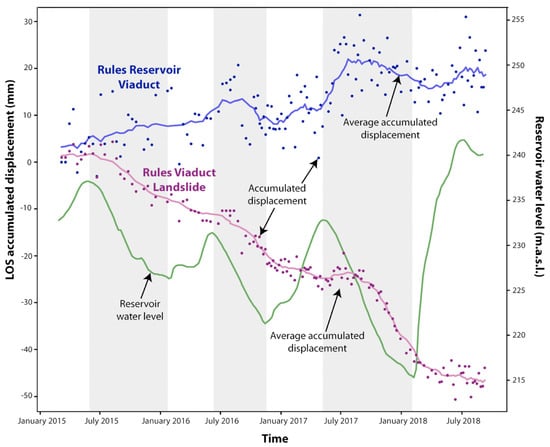 Time series in line of sight of accumulated displacement of the Rules Viaduct Landslide and the Rules Viaduct. Water level of the Rules Reservoir is also represented. Grey columns indicate periods of reservoir drawdown. Note the noise of the Rules Viaduct TS in comparison with the Rules Viaduct Landslide TS.