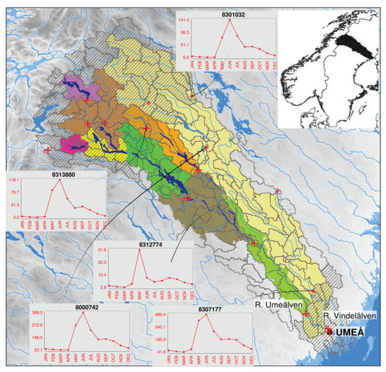 The study area with the regulated main Umeälven tributary and the unregulated upper Vindelälven arm coloured light yellow. The red asterisks and crosses are the unregulated and regulated gauging stations, respectively and the coloured polygons are the 9 local inflow regions. The hatched areas in the head water and coastal regions are where the satellite passive microwave snow product is known to be erroneous. The overlaid grey-bounded polygons are the sub-basins in the catchment. The curves are the annual regimes at the five unregulated stations, the numeric headings are the station IDs used in Figure 7.