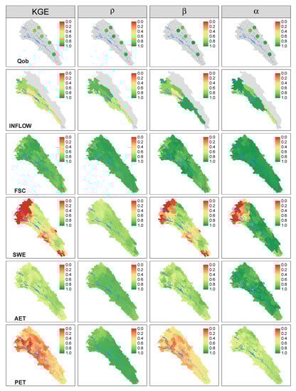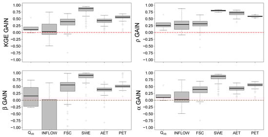 We next investigated the gain in model performance by assimilating the six products individually. Figure 4 shows that the median gain in KGE and improvements in and were above zero for all products. The improvement in beta with INFLOW assimilated was very low, possibly because of the already very high value of the open-loop simulation (25th percentiles of all coefficients were below the open-loop simulation). The assimilation significantly improved the modelled SWE and PET despite the poor performance in some regions of the study area (see Figure 2). The model failure in some regions was partly due to the datasets, e.g., the passive microwave snow product in mountainous terrain and coastal areas or when snow is deep. The MODIS evapotranspiration is also known to be consistently biased [10] although it is also possible that the model was unable to properly represent processes in those regions.