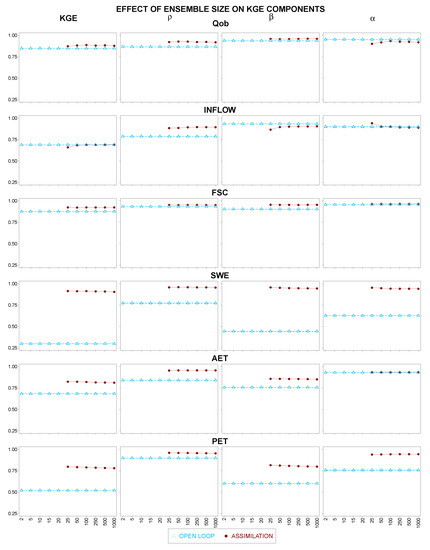 The effect of varying the ensemble size on the KGE and its components (columns) for the six assimilated products (rows). The filled red markers are the assimilations and the horizontal blue dashed lines with hollow triangles are the corresponding open-loop simulations. The reservoir inflow and FSC assimilations crashed with less than 25 members in the ensemble.