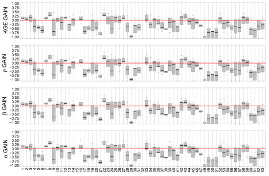 The gain in the KGE and its components computed with the stream discharge from the different assimilations. The numbers on the x-axis are the assimilations enumerates in Table A1 and the red lines are the open-loop simulations.