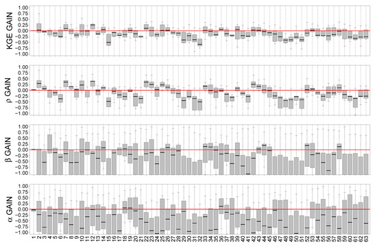 where and are the performances with and without data assimilation, respectively. The improvements in the individual components of the KGE could also be viewed as performance gains. The gains are considered relative to the open-loop simulation in which no data is assimilated.