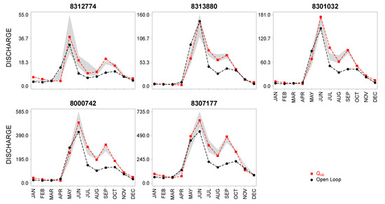 The simulated average monthly discharges during 2001 at the calibration stations (IDs are the sub-figure titles) for the informative assimilations ensemble (filled polygon) compared to the observations (red) and open-loop simulation (black). The location of the stations in the study area is shown in Figure 1.