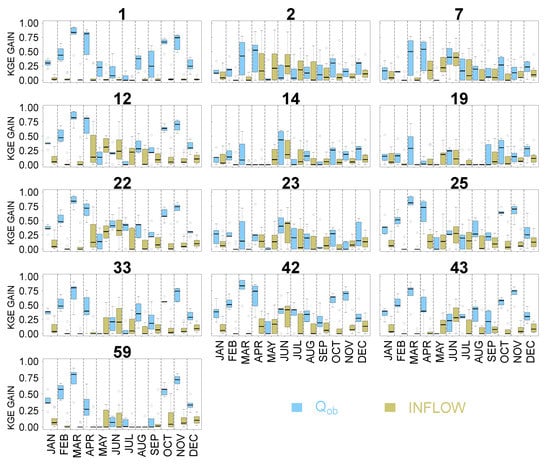 The monthly gains in the KGE computed for stream discharge (blue) and reservoir inflow (green) for informative assimilations (titles of the individual sub-figures are the row numbers taken from Table A1).