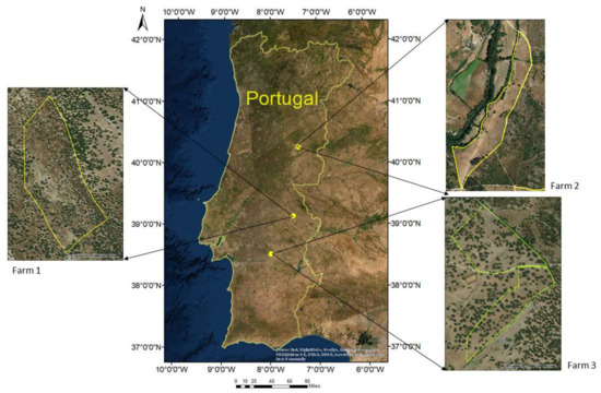 Location of the farms and parcels used in the present study: the limits of the parcels in farm 1 (Monforte municipality, left side), farm 2 (Covilhã municipality, top right) and farm 3 (Évora, bottom right) are shown together with the respective aerial image.