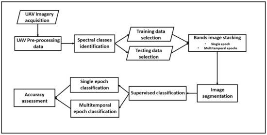 In this paper, we implemented the six-step method illustrated in Figure 2. The stages were: (i) acquisition and preprocessing of photogrammetric UAV imagery; (ii) preparation of data for classification; (iii) training and testing data selection; (iv) image segmentation; (v) classification procedures and (vi) accuracy assessment. Each stage is described in the next subsections.