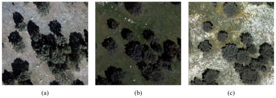Multitemporal classifications had higher overall accuracies and kappa indices than single epoch classifications in most cases because it took into account the temporal variability of vegetation and climate [46]. The land cover-specific variability of reflectance of the different strata was particularly important to distinguish between trees/shrubs and pasture. While perennial leaf trees, which are the most frequent in these Montado regions, remain approximately constant in shape and color throughout the year, the characteristics of SBP vary widely. SBP go through a green stage in autumn/early winter, flower and see a boom in productivity in the spring, and completely dry out in the summer. These changes are clearly seen in our UAV data for the study period. Farm 1 is particularly sensitive to the classification approach, as overall accuracy from multitemporal classification was about 4% higher. In our study, we only used three epochs to evaluate the influence of temporal variability. A previous study [46] considered different time steps of UAV imagery classification. They found that the overall accuracy of results increased by 3% with two or more images compared with using a single image. Our results agree with this observation. This could potentially indicate that the results would be unaffected by adding more epochs. However, the improvement in accuracy is unevenly distributed between the classes and particularly affects classes with lower area (such as bare soil, in our case). The addition of further epochs comes at a cost due to the time and resources involved to carry out UAV flights, and therefore, the cost-benefit of adding more epochs should be carefully evaluated in the future. There are additional approaches for multitemporal analyses that can be tested. For example, very high resolution (VHR) satellite data can be used to increase the temporal resolution of UAV images through fusion of data acquired with different spatial and radiometric resolution, such as those based on concept of “super-resolution” [47].