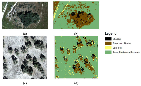Extract of the aerial photograph of farm 2 (a) and respective Random Forest single epoch classification (b). Extract of the aerial photograph of farm 1 (c) and respective Artificial Neural Network single epoch classification (d).