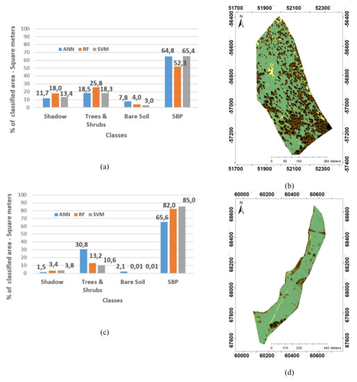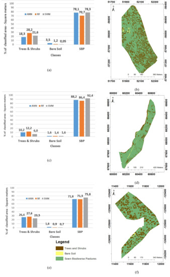 Analyzing Figure 5 and Figure 6, the area classified as SBP increased as a percentage of the total in comparison with single epoch classification. This result was expected because in multitemporal classification, we considered tree shadows as SBP areas. In general, the percentage of area classified as trees and shrubs was similar for both classification approaches in farm 3. In farm 1, the area of trees and shrubs was approximately 10% higher using RF multitemporal classification than the single epoch approach. In farm 2, multitemporal classification resulted in lower three coverage than single epoch classification, particularly with the ANN algorithm (31% compared to 10%) and SVM (11% and 6%).