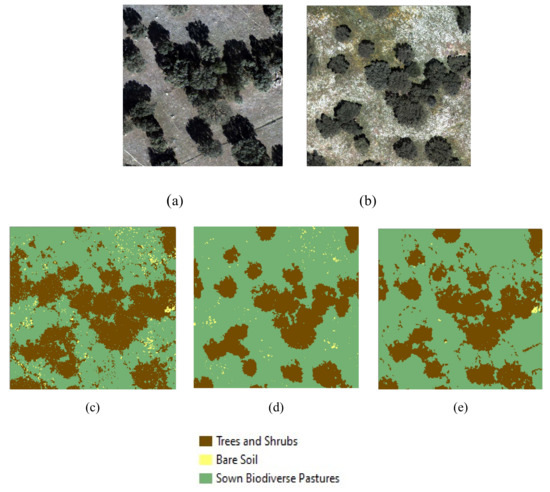 This work introduced multiple aspects for consideration in future research. One aspect that should be explained and overcome is the confusion in the boundary of shadows displayed by ANN and RF classifiers due to the spectral transition from shadow to pasture/tree segments. Also, we intend to improve the tree segmentation and classification procedures. Devising alternative efficient approaches to reducing the effects of shadows in single epoch classifications is also a topic worthy of further exploration in future studies. As it is necessary to simultaneously increase the temporal resolution of the data and reduce the costs and efforts of acquisition of new UAV data, one possible way forward is to use methods that combine UAV data with VHR satellite imagery. The results here were mainly evaluated for SBP. In the future, the workflow can be easily applied to other types of pasture in agroforestry systems.