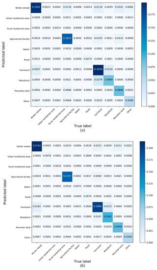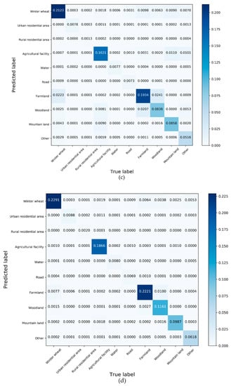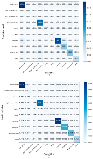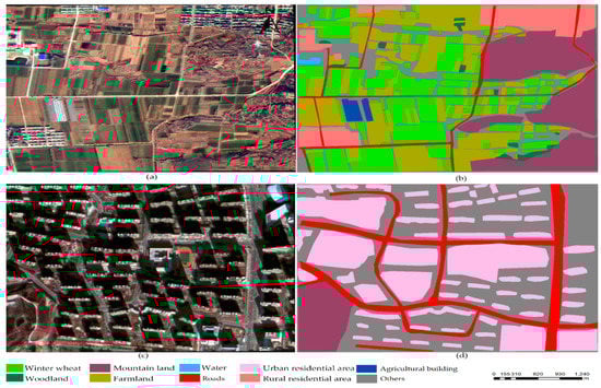 Larger image blocks are advantageous for model training. Considering the hardware used in our research, we cut each pre-processed image into equal-sized image blocks (1000 × 1000 pixels). A total of 920 cloudless image blocks were selected for manual labeling with numbers assigned to the following categories: (1) winter wheat, (2) mountain land, (3) water, (4) urban residential area, (5) agricultural building, (6) woodland, (7) farm land, (8) roads, (9) rural residential area, and (10) others. While selecting the pixel blocks, we used the following principle: each pixel block should contain at least three land-use types, where the area proportion of each land-use type in the selected images was similar to that in the pre-processed images.