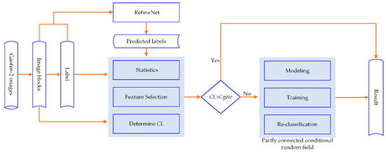 Based on previous studies [,,,,], approximately 80% of the pixel-by-pixel classification results generated by CNN models are credible. Therefore, only approximately 20% of the pixel classification results require post-processing. This strategy can significantly reduce the number of calculations, thereby improving the efficiency and performance of the model. This is in reference to our use of term “partly connected.”