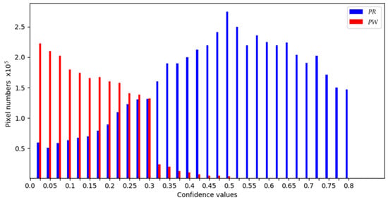 Third, a histogram was produced for PR and PW using the CL as the x-axis and the number of pixels corresponding to a certain CL value as the y-axis. Figure 5 provides an example of a histogram, which was used to determine the value of Cgate. In general, the principle is that when CL is greater than Cgate, the number of misclassified pixels should be as small as possible.