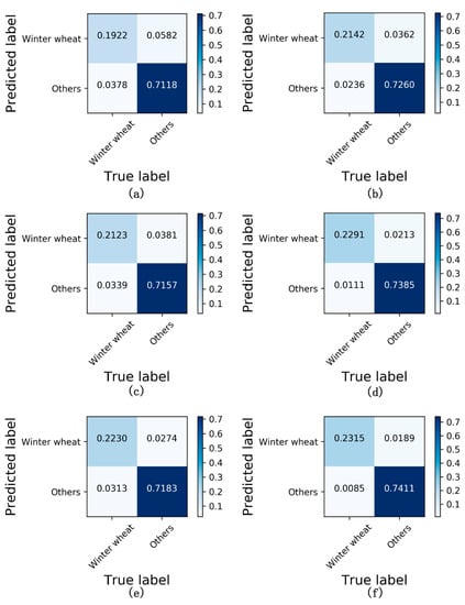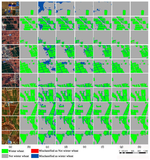 In low-spatial-resolution images, such as from Moderate Resolution Imaging Spectroradiometer (MODIS) and Enhanced Thematic Mapper/Thematic Mapper (ETM/TM), pixels inside winter wheat and other crop fields have good consistency and low change rates, which can better distinguish crop fields from other land-use types [,]. However, at the edge of the crop planting area, the feature value extracted from the mixed pixels has a weak discrimination ability, resulting in more pixels being misclassified [,]. In addition, differences in crop growth within the planting area adversely affect the spectral feature extraction, thereby resulting in mis-segmented pixels that form the so-called "salt and pepper" phenomenon [,].