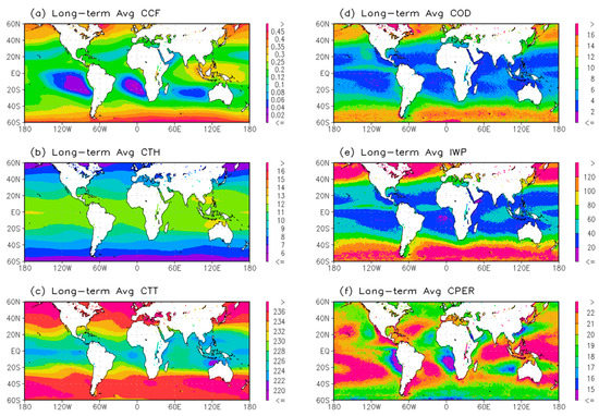Global distributions of (a) cloud cover fraction (CCF), (b) cloud top height (CTH) (km), (c) cloud top temperature (CTT) (K), (d) cloud optical depth (COD), (e) ice water path (IWP) (g/m2), and (f) cloud particle effective radius (CPER) ( µm) for their long-term averaged monthly mean values from 1981.1 to 2011.12 for cirrus clouds.
