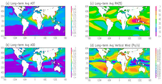 Long-term mean of (a) satellite aerosol optical thickness (AOT) at 0.63 µm; (b) model aerosol optical depth (AOD) at 0.5 µm; (c) climate forecast system reanalysis relative humidity (CFSR RH) (%) averaged for six pressure levels (100 mb, 150 mb, 200 mb, 250 mb, 300 mb, and 400 mb); and (d) CFSR vertical velocity (Pa/s) on a 300 mb pressure level (negative/positive value indicate upward/downward motion).