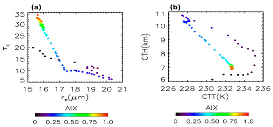 Scatterplot of (a) re (or CPER) versus τc (or COD) and (b) CTT versus CTH for the mean values of CPER, COD, CTT, and CTH in individual bins of the AIX defined in Figure 3. The corresponding AIX values are color-coded for each data point.
