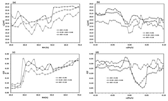 Relationship of re (or CPER) with meteorological variables (a) RH (%) and (b) ω((Pa/s) and CCF with (c) RH and (d) ω for three aerosol-loading conditions: AIX < 0.18, 0.18 < AIX < 0.46, and AIX > 0.46, which correspond to the three AIX regimes defined in Figure 3. The data is binned according to RH and ω with incremental intervals of 2 and 0.005, respectively. The symbols represent the mean value of individual bins.