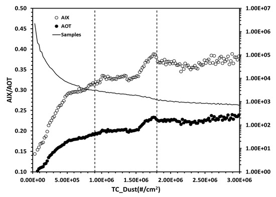 Long-term averaged global ocean AIX and AOT binned according to the corresponding total column number concentration of dust particles (TC_Dust) with 2.0 × 104 incremental intervals. The mean values of AIX and AOT for individual bins are displayed using the two symbols, respectively. The general line is the sample number for each bin, and the corresponding values are given by the vertical coordinate on the right-hand side. Two vertical dash lines divide the plot into three regimes schematically.