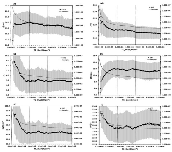 In Regime 2, the decreasing trend of CPER with increasing TC_Dust is consistent with its decreasing trend with the AIX increase in Regime II. The change tendency of COD and IWP with increasing TC_Dust in the first-half part of Regime 2 is marginally consistent with their change tendency due to increasing the AIX in Regime II. However, in the second-half part of Regime 2, their changing trend with TC_Dust is different from that due to the AIX increase. CCF shows a minor decreasing trend with increasing TC_Dust that is different from its changing trend with the AIX increase in Regime II. CTH (or CTT) shows a minor decrease (or increase) trend with the increase of TC_Dust in the first-half part of Regime 2 but reverses to marginally increase (or decrease) in the second-half part of the regime, which is consistent with their variation trends in the first-half part of Regime II but very different from those in the second-half part of Regime II. These results also corroborate the conclusion drawn in the above discussion of Figure 7 that the efficacy of the AIX serving as a proxy for IN or CCN abundance in Regime II is not as optimal as in Regime I.