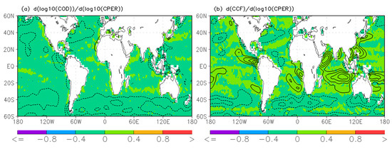 Similar to Figure 9 but for the sensitivity of (a) COD and (b) CCF to CPER variation. The areas where the confidence level of the sensitivity is above 95% are marked by the contours.