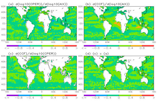 Global distributions for the sensitivity of (a) CPER and (b) CCF relative to the AIX and (c) CCF relative to CPER (d) is the product of (a) and (c). The computation is performed for 2.5° × 2.5° spatial grids over the global oceans using the original long-term averaged CCF, CPER, and AIX data in 0.1° × 0.1° spatial resolution.