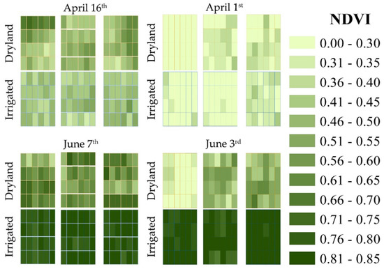 In-field spatial variability in NDVI across wheat genotypes was observed in both site years and under both dryland and irrigated conditions (Figure 3). Visual assessment of the data indicates that a higher level of spatial variability existed under dryland conditions for site year II across the 24 wheat genotypes. This may potentially be explained by different water stress responses across genotypes which could differently affect the chlorophyll content and green biomass from one genotype to the other [15]. The spatial variability of NDVI measurements was also observed by other studies [52,53].