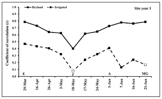 Correlation coefficient (r) between NDVI and grain yield across 24 winter wheat genotypes for site year I under dryland (solid line) and irrigated (dashed line) conditions across crop growth stages. Critical growth stages are indicated as A = anthesis growth stage, E = early spring growth stage, J = jointing growth stage, and MG = mid-grain filling growth stage. Solid symbols show a significant correlation between NDVI and yield (p-value < 0.05).