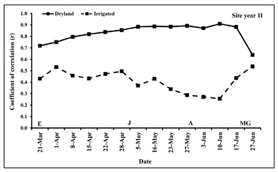 For site year II, under dryland conditions, the correlation coefficients between NDVI and grain yield were significant for all wheat growth stages (p-value < 0.05), increasing gradually from early growth stages to late growth stages. The highest correlation coefficient (r = 0.91) was observed between anthesis and mid-grain filling stages (Figure 5). Supplementary material shows the correlation coefficients (r) between NDVI measurements for 14 dates and grain yield with 72 observations (24 wheat genotypes times three replications) under dryland conditions at site year II (Figure S3).
