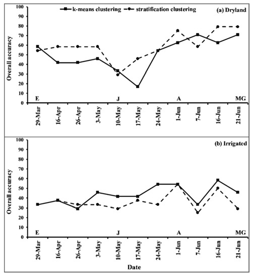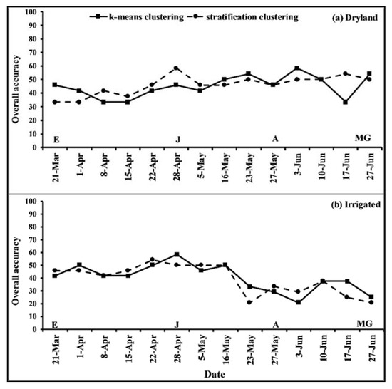 Overall accuracy results from contingency table comparing mean grain yield classes to mean NDVI classes using k-means clustering (solid line with squares) and stratification clustering (dashed line with circles). The overall accuracy is presented across 14 dates for site year II under (a) dryland conditions and (b) irrigated conditions. Critical growth stages are indicated as A = anthesis growth stage, E = early spring growth stage, J = jointing growth stage, and MG = mid-grain filling growth stage.