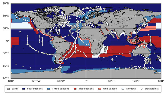 Sample locations for photosynthesis versus irradiance (P-I) experiments obtained from databases and literature with seasonal coverage in each biogeographic province as defined by Longhurst (2007). A total of 8676 P-I experiments were used in the present study, covering 53 biogeographic provinces and 96.6% of the world’s ocean. High seasonal data coverage was obtained for 37 provinces (3–4 seasons, 79.9% coverage).
